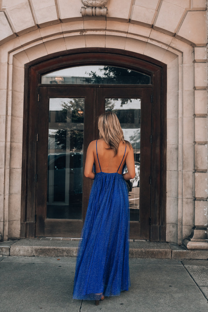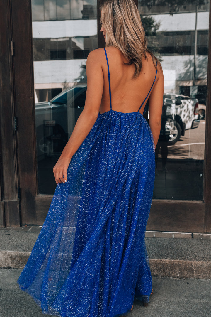 Like getting lost in a glistening blue ocean, our Marisol Glitter Maxi Dress is perfect in the moonlight and looks stunning on everyone! This evening dress is backless and features adjustable straps, a v-neckline, elastic waistline, and glitter detailing.