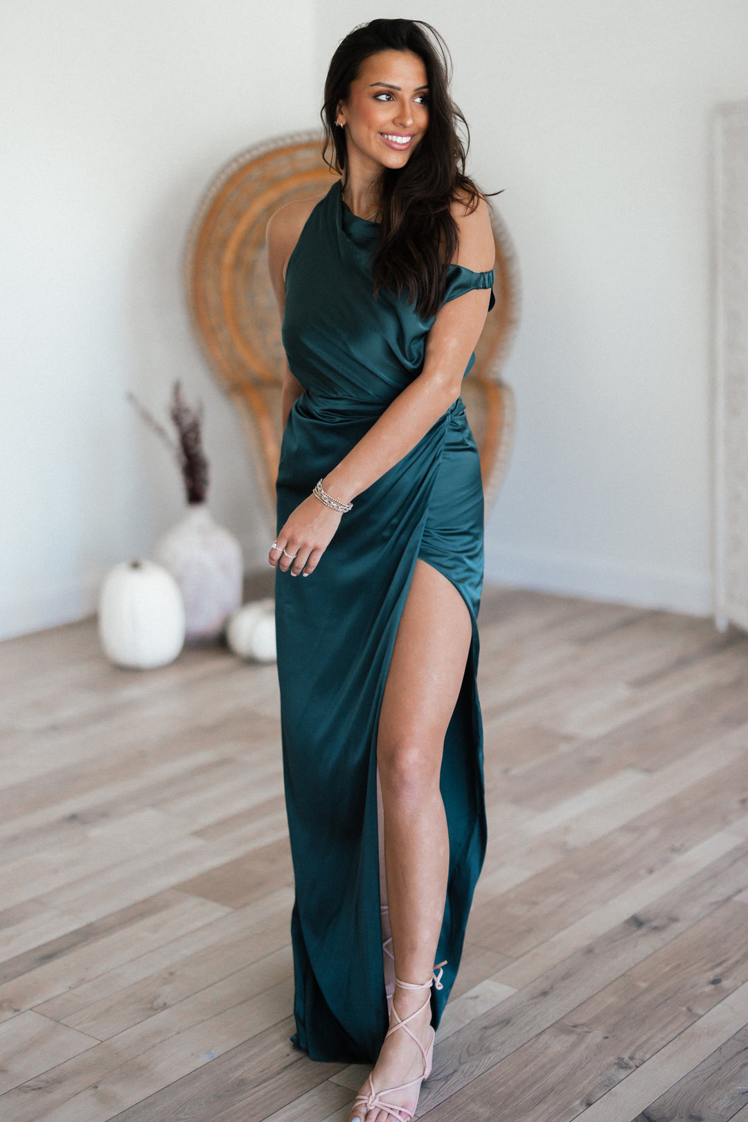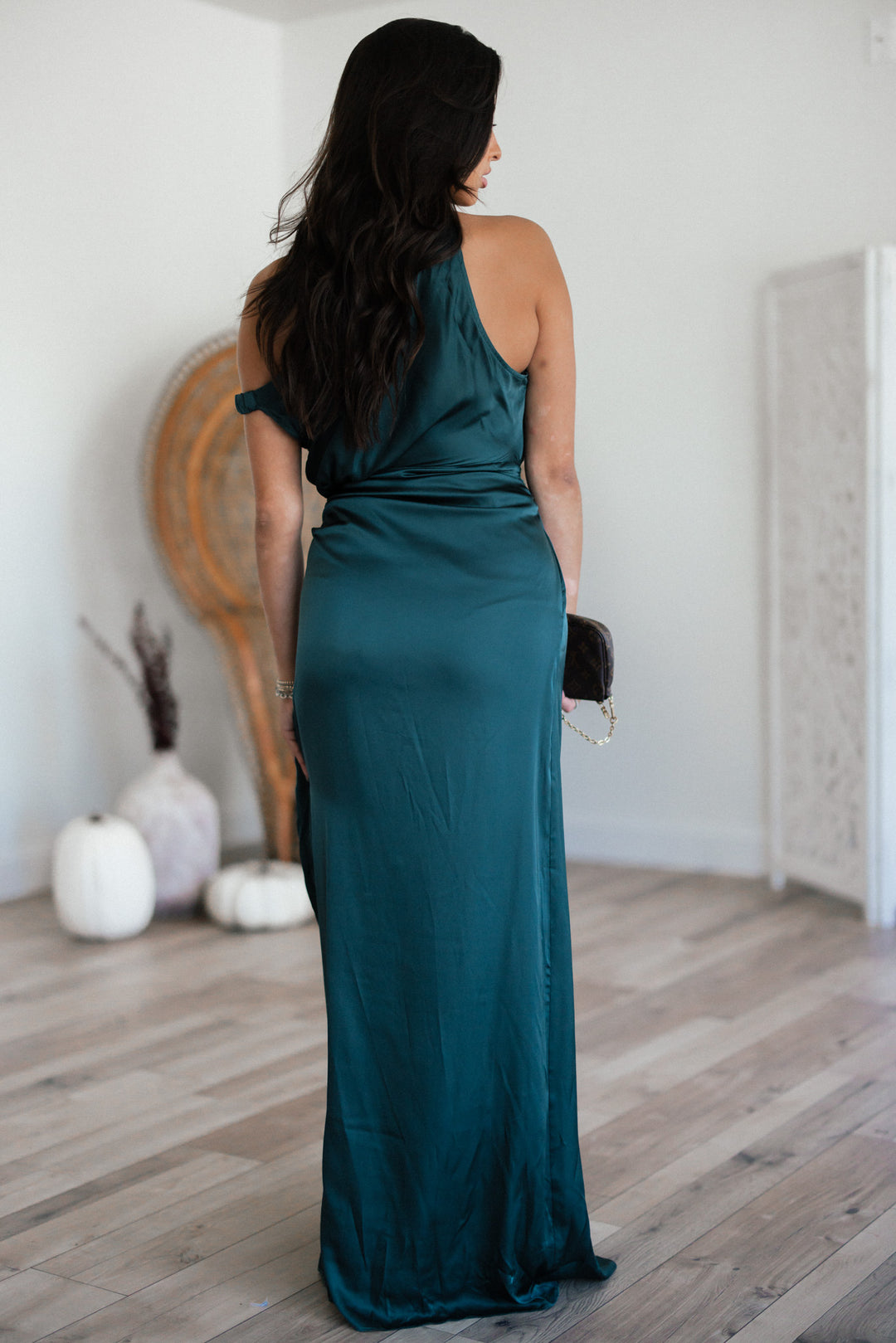 After Hours Satin One Shoulder Maxi Dress (Hunter Green)