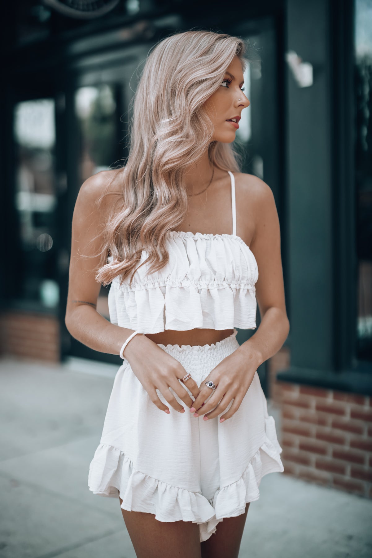 You'll look just as sweet as the first bloom of spring with the My Darling Ruffle Short Set! Lightweight and breezy woven fabric shapes a high ruffle-trimmed waist (with an elastic waistband) and a short bloomer-inspired silhouette with ruffles at the hem.